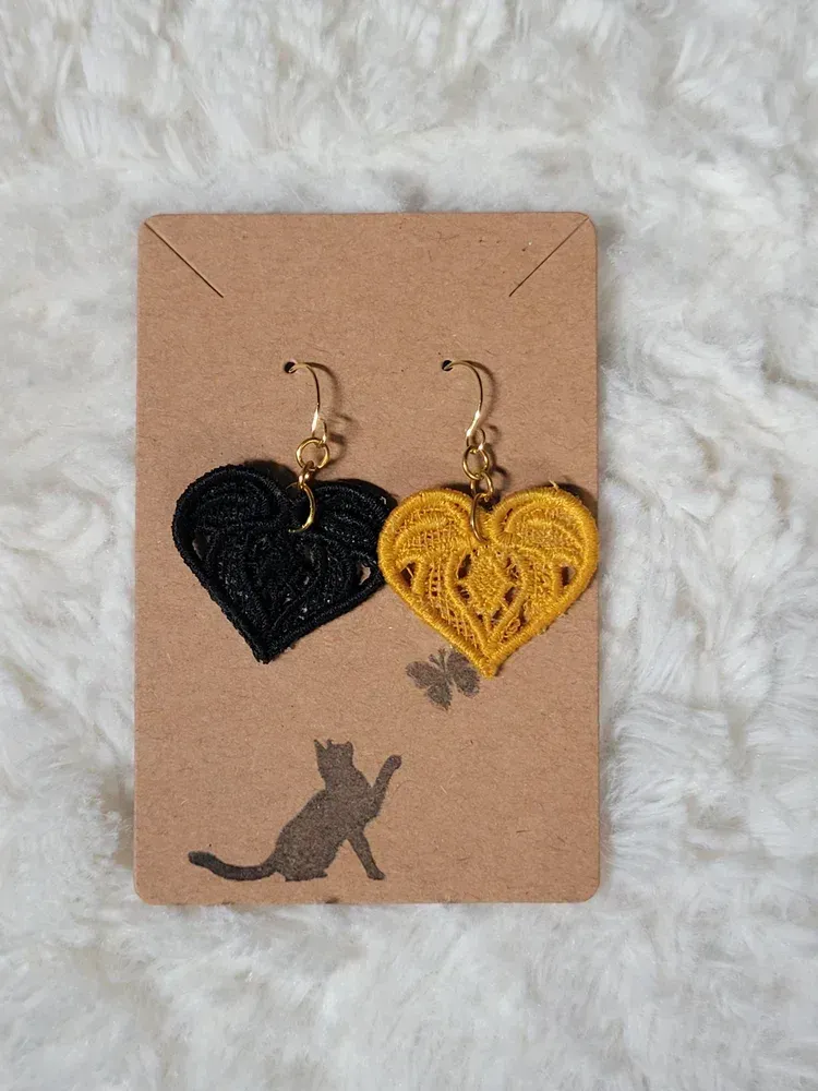 Show your love for the Cameron Dragons with these Gold and Black heart lace earrings!